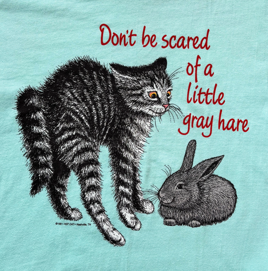 Vintage Cat Lover Graphic T-Shirt - "Don't Be Scared of a Little Gray Hare" Funny Cat Tee