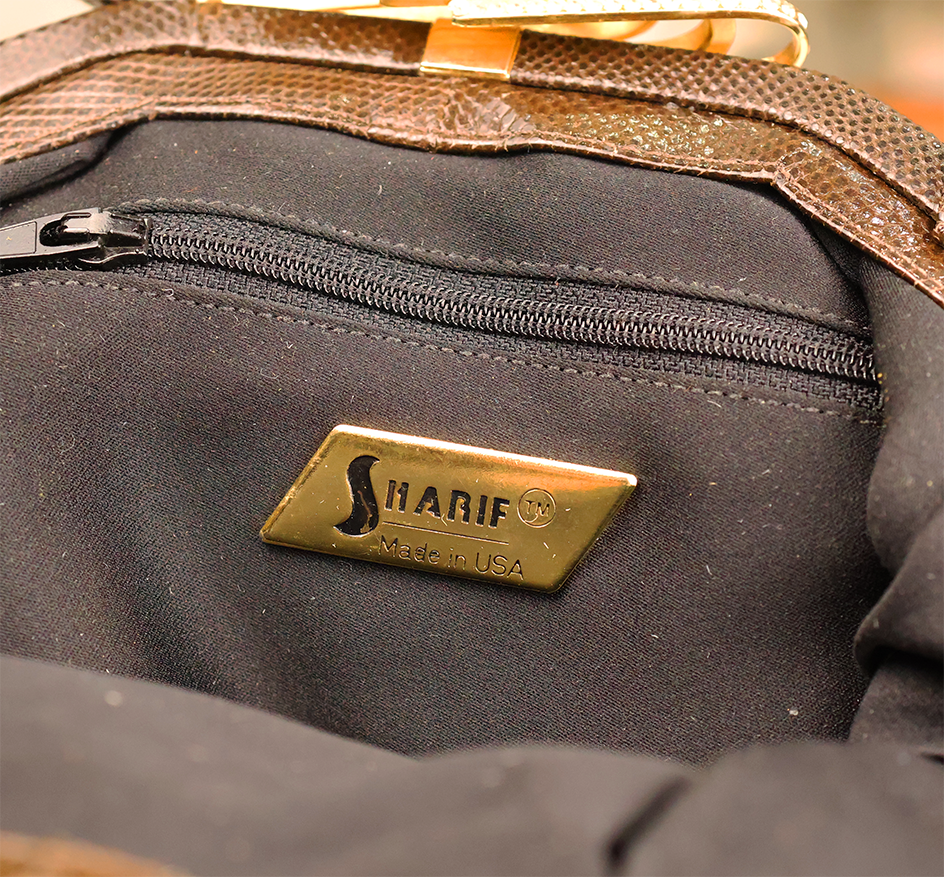 Vintage Sharif El-Fouly handbag crafted from genuine lizard leather -- a statement piece from the iconic 1980s designer. Known for his luxurious textures and sculptural silhouettes, this rare handbag features a rich chocolate tone and unique brass and crystal closure. A must-have for collectors of vintage designer bags and fans of bold ‘80s fashion.