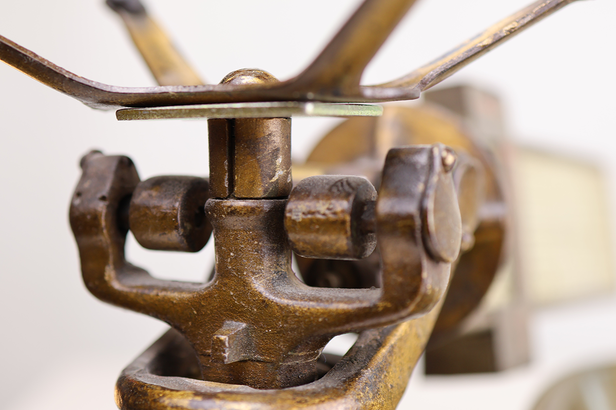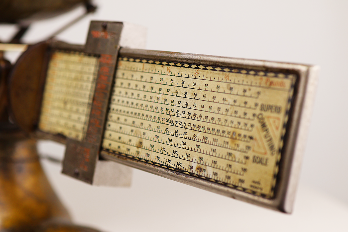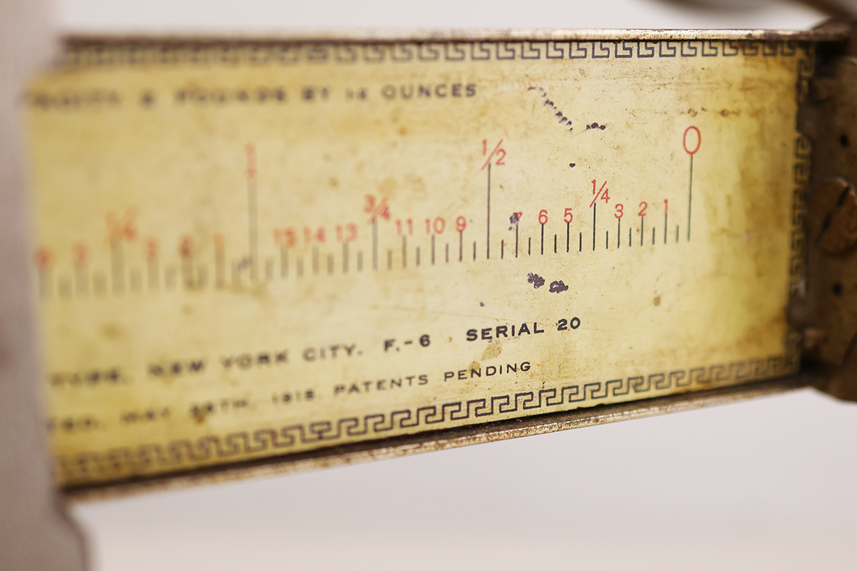 Antique freaks, rise up! This beautifully patinaed brass scale once measured up to 2lbs of goods at any given corner mercantile. Now, restored to its prior beauty, this piece is waiting to weigh in on your kitchen counter! Made by longtime manufacturer Pelouze, this scale features the original logo and removable brass dish.