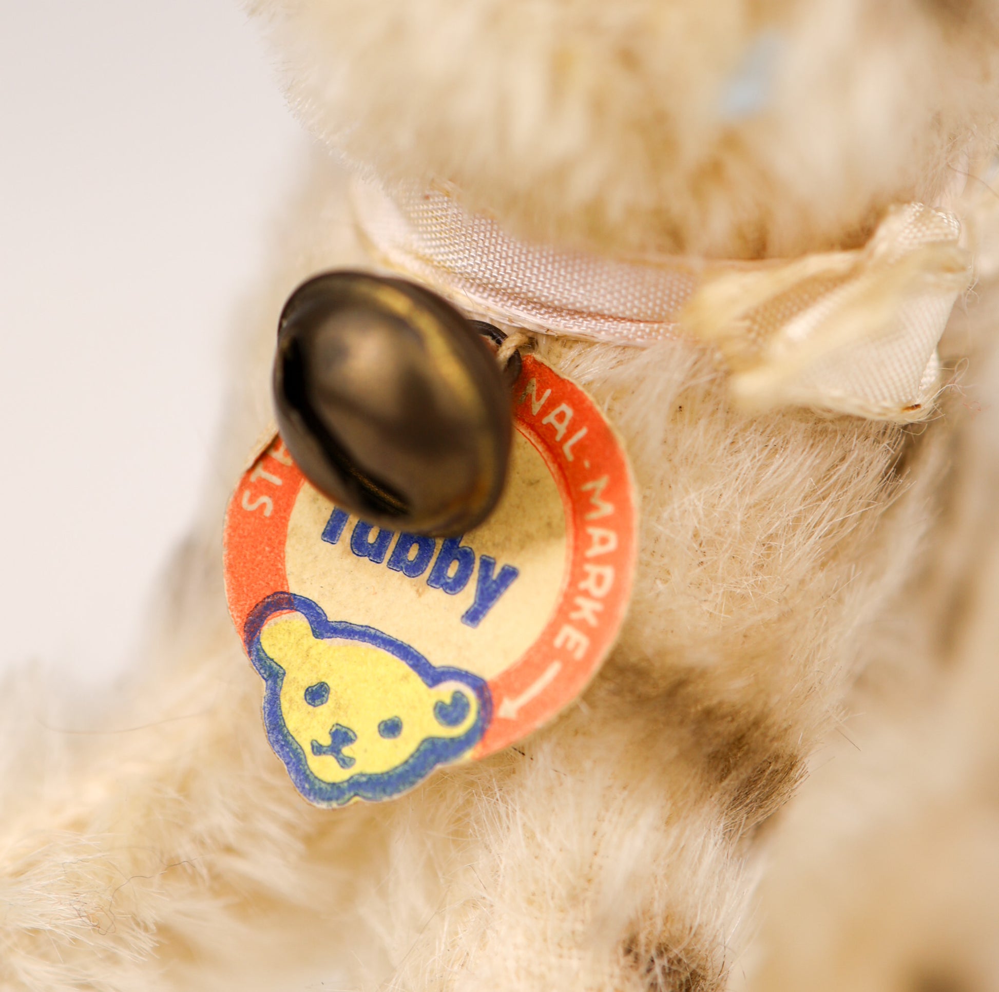 A darling heirloom-quality kitten that deserves a forever shelf. This sweet little fluffball is a vintage Steiff mohair kitten, complete with button eyes, hand-stitched features, and its original chest tag and bell. Made in Germany, this collectible tabby is softly airbrushed with brown stripes and crafted from luxurious mohair—typical of Steiff’s midcentury golden age.