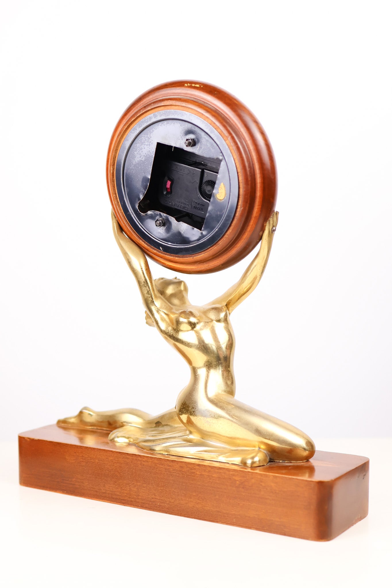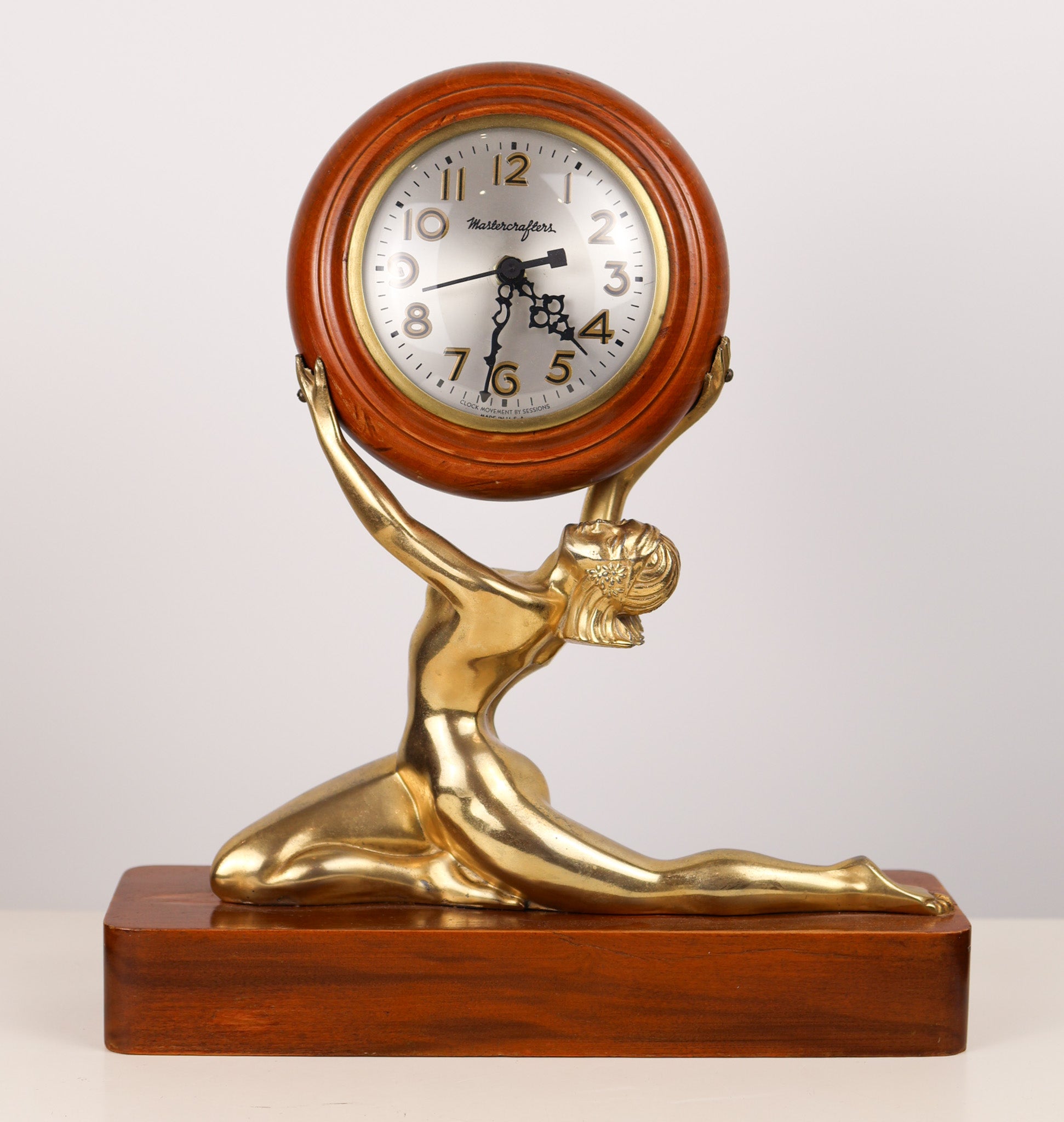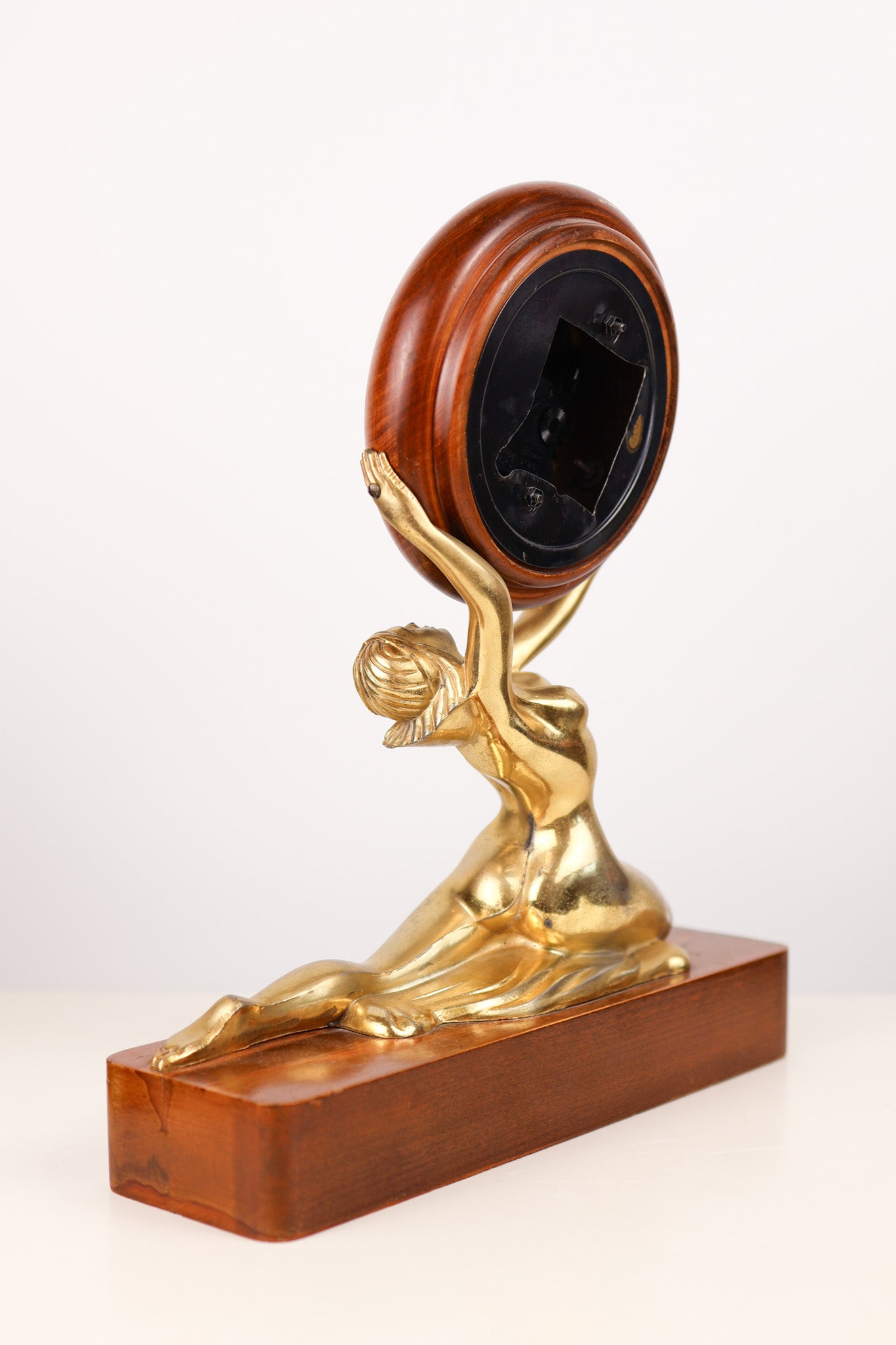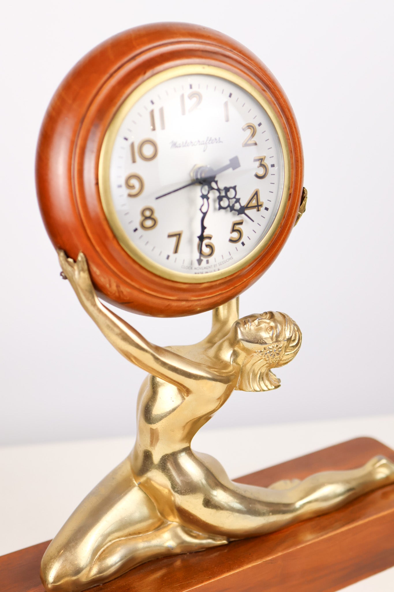 A stunning vintage clock by Mastercrafters, featuring a glamorous Art Deco-style nude woman in gold-tone metal, gracefully holding up a round clock with wood casing. Set on a rich wooden base, this electric mantel clock captures mid-century elegance and theatrical flair. A striking collector’s piece for lovers of vintage timepieces, Art Deco revival decor, or sculptural home accents.