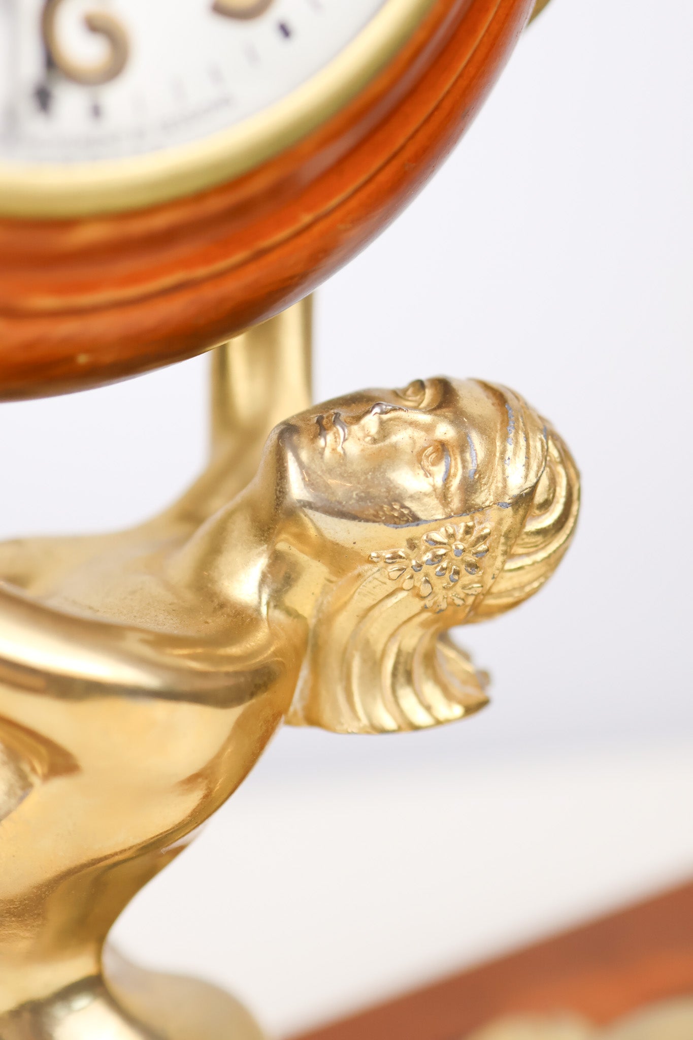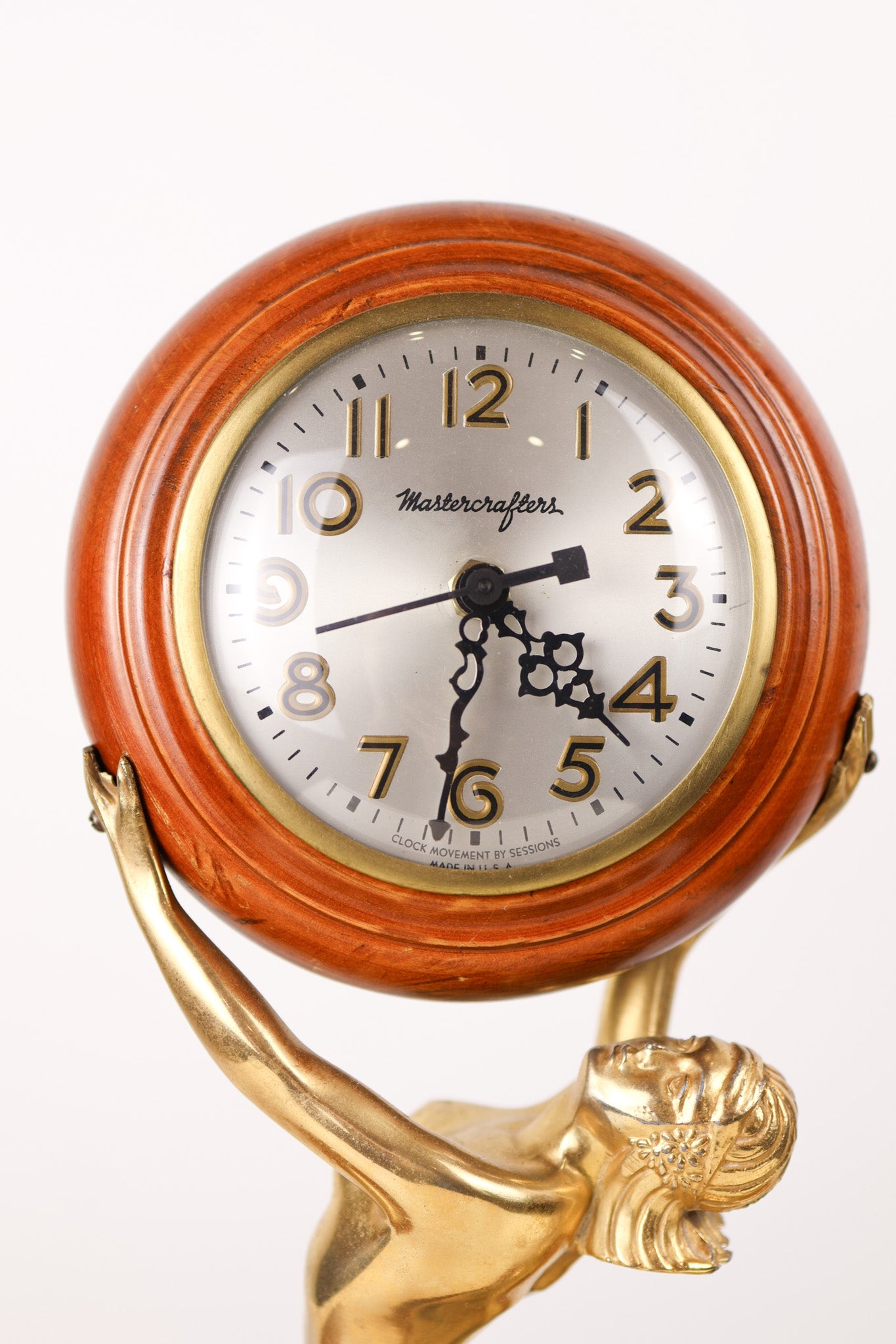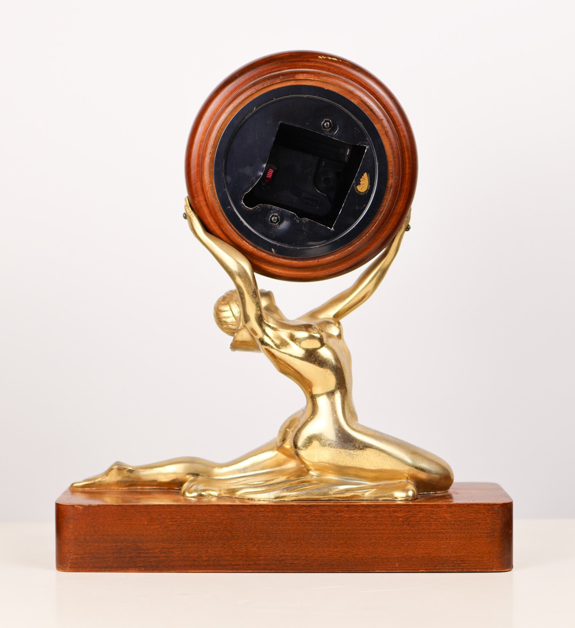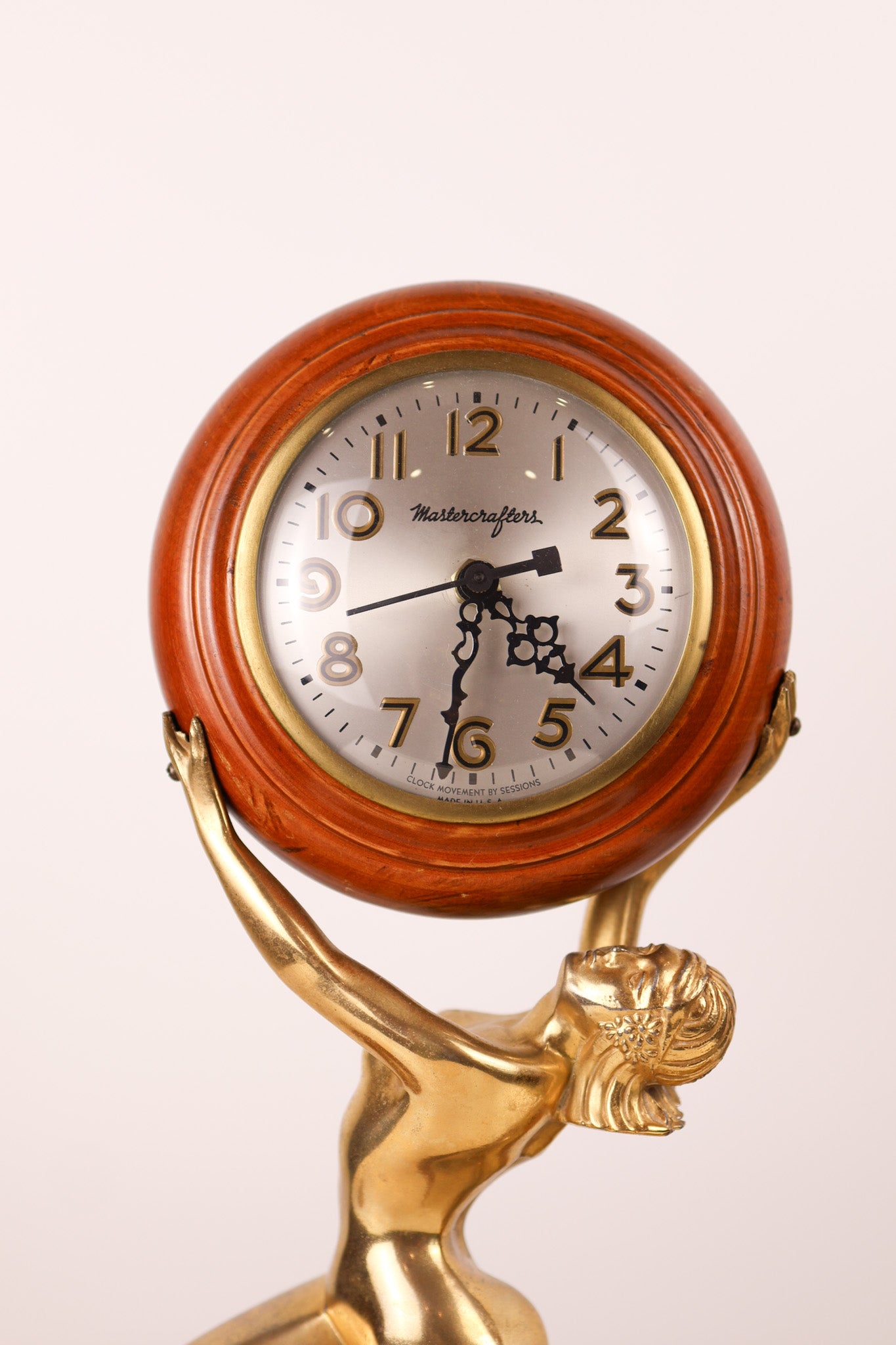 A stunning vintage clock by Mastercrafters, featuring a glamorous Art Deco-style nude woman in gold-tone metal, gracefully holding up a round clock with wood casing. Set on a rich wooden base, this electric mantel clock captures mid-century elegance and theatrical flair. A striking collector’s piece for lovers of vintage timepieces, Art Deco revival decor, or sculptural home accents.