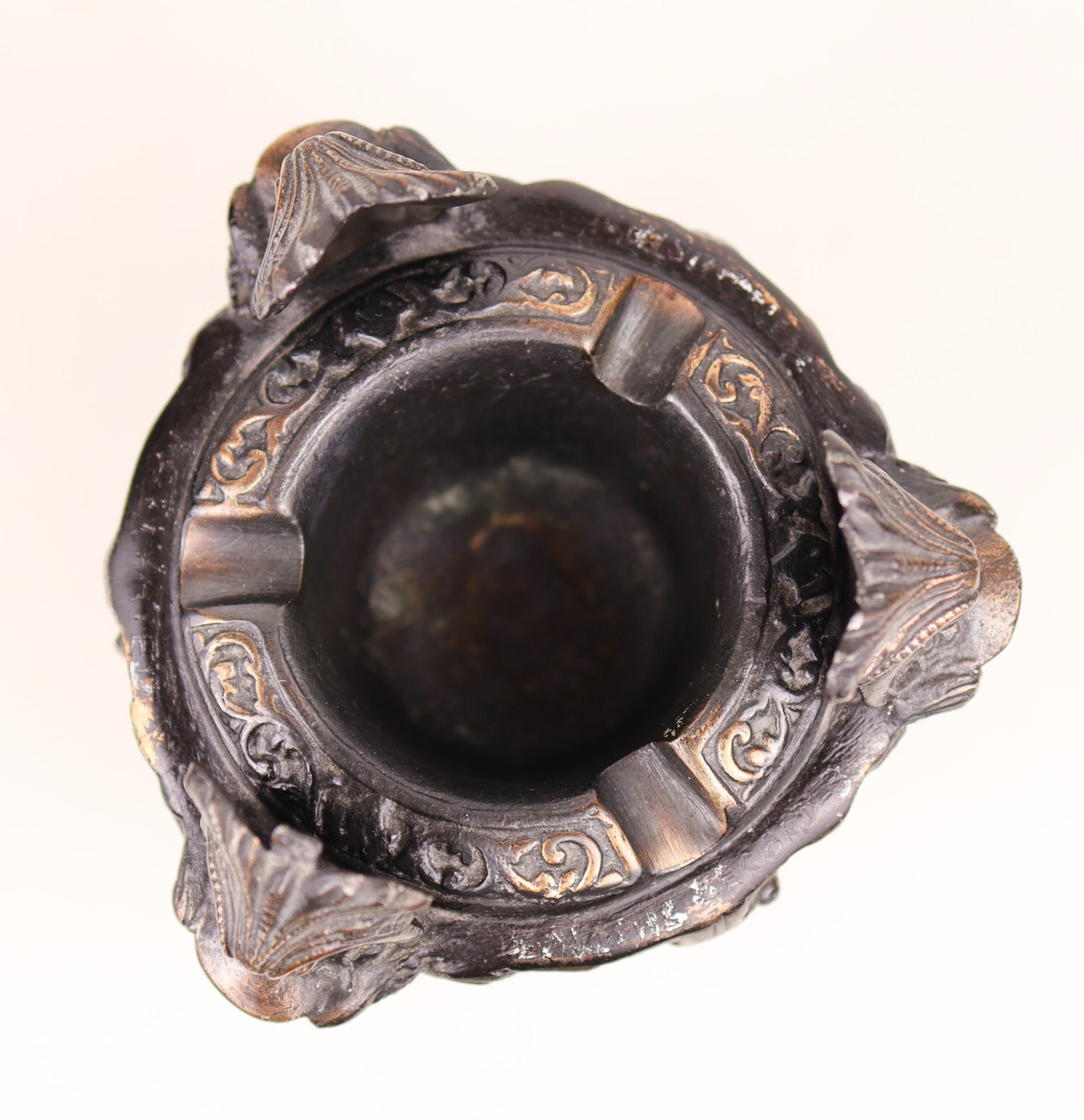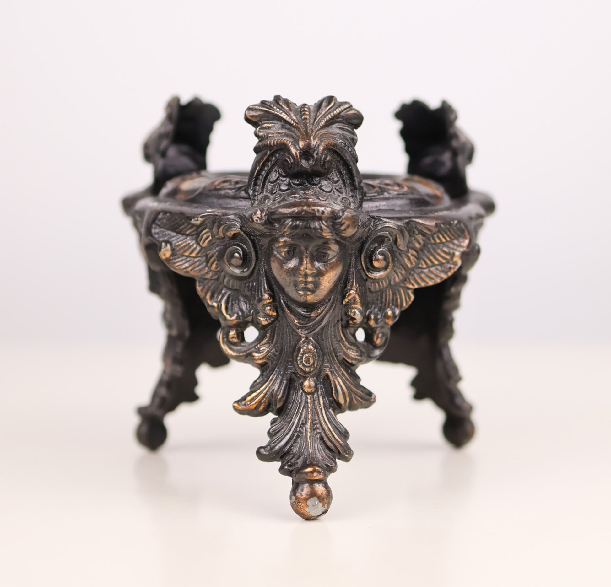 Versace Mansion Vibes! This ornate antique ashtray is a striking example of art nouveau design, cast in heavy metal with a dark bronze patina and golden highlights. Each side features an elaborate winged female figure framed by scrolls and acanthus leaves. Raised on clawed feet with a triform shape, this piece likely dates to the early 20th century and once served as a tabletop smoking accessory. Whether used for its original purpose or as a dramatic catchall or display piece, it adds instant mystique and historical charm to any setting.
