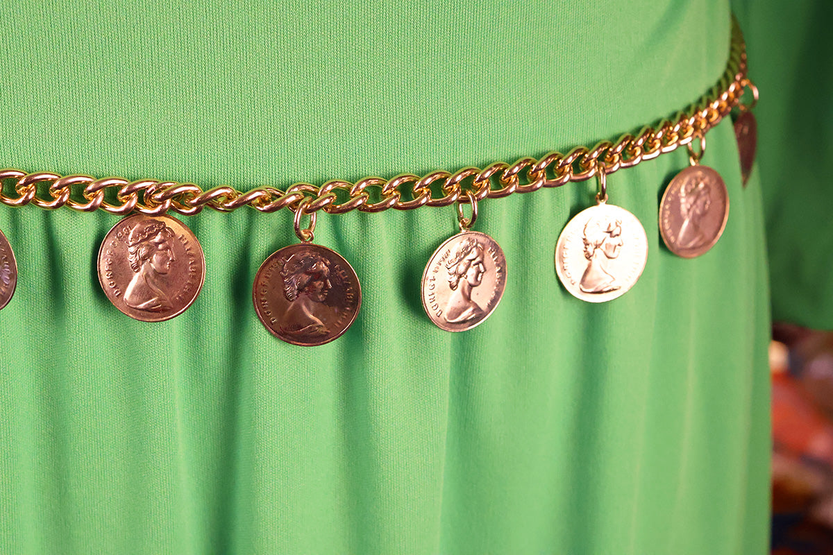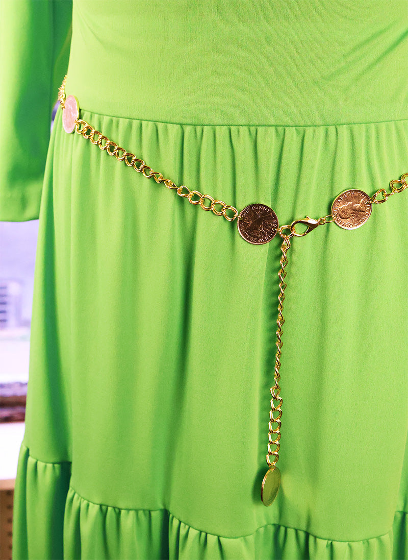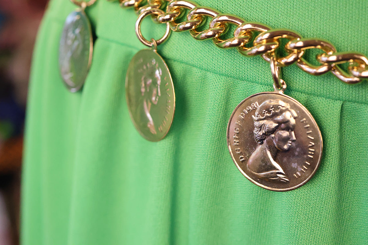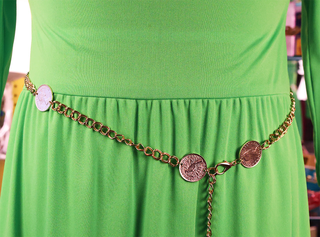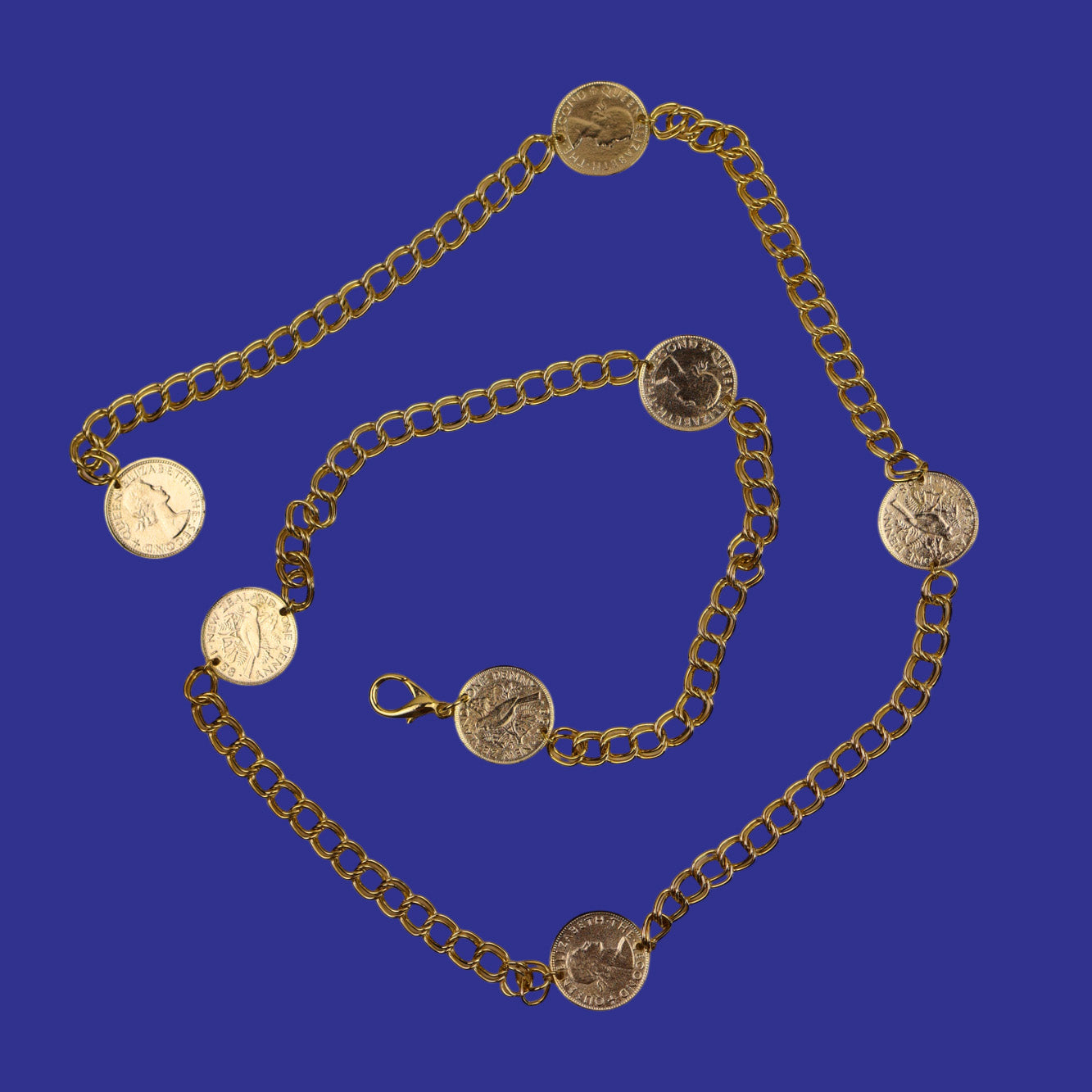 Strike gold with this deadstock vintage coin belt, featuring a chunky gold-tone chain dripping in faux coins stamped with regal profiles. Straight out of the 1990s, this statement piece gives high-fashion glam with a touch of ancient empire energy—think runway meets Cleopatra.