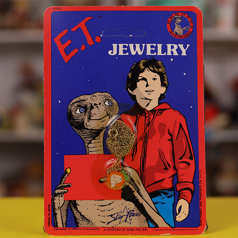 Relive the magic of Spielberg’s iconic sci-fi classic with these vintage E.T. enamel necklaces. Officially licensed by Universal Studios, these colorful pins come on their original 1980s Star Power-branded card. A nostalgic gem for collectors, vintage jewelry lovers, and extraterrestrial enthusiasts alike.