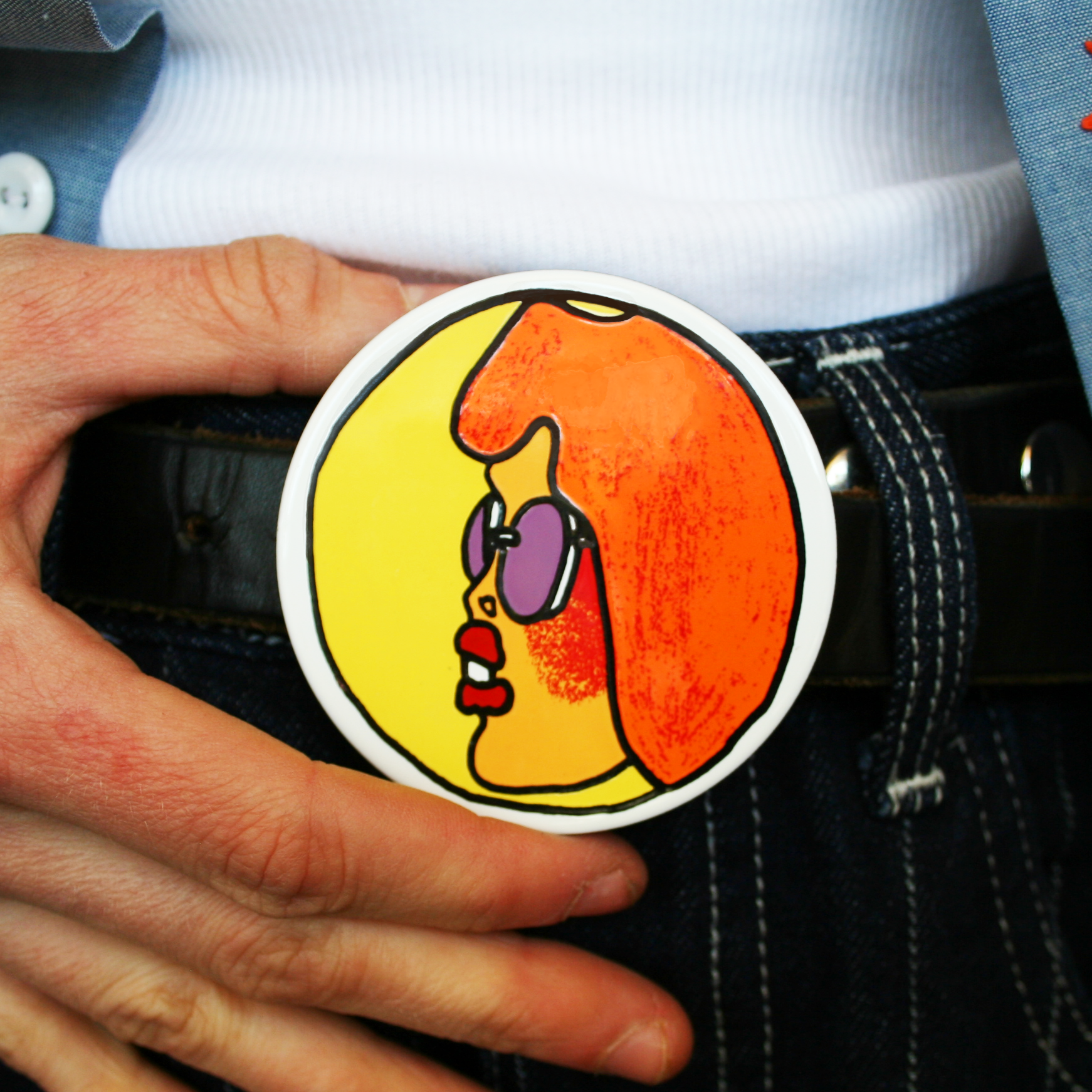 Turn heads (and hips) with this deadstock enamel belt buckle featuring a bold, pop-art style redhead rocking purple sunglasses a cool 'tude. With a vibrant yellow and orange color palette and mod design, this piece is a wearable time capsule. Far out!