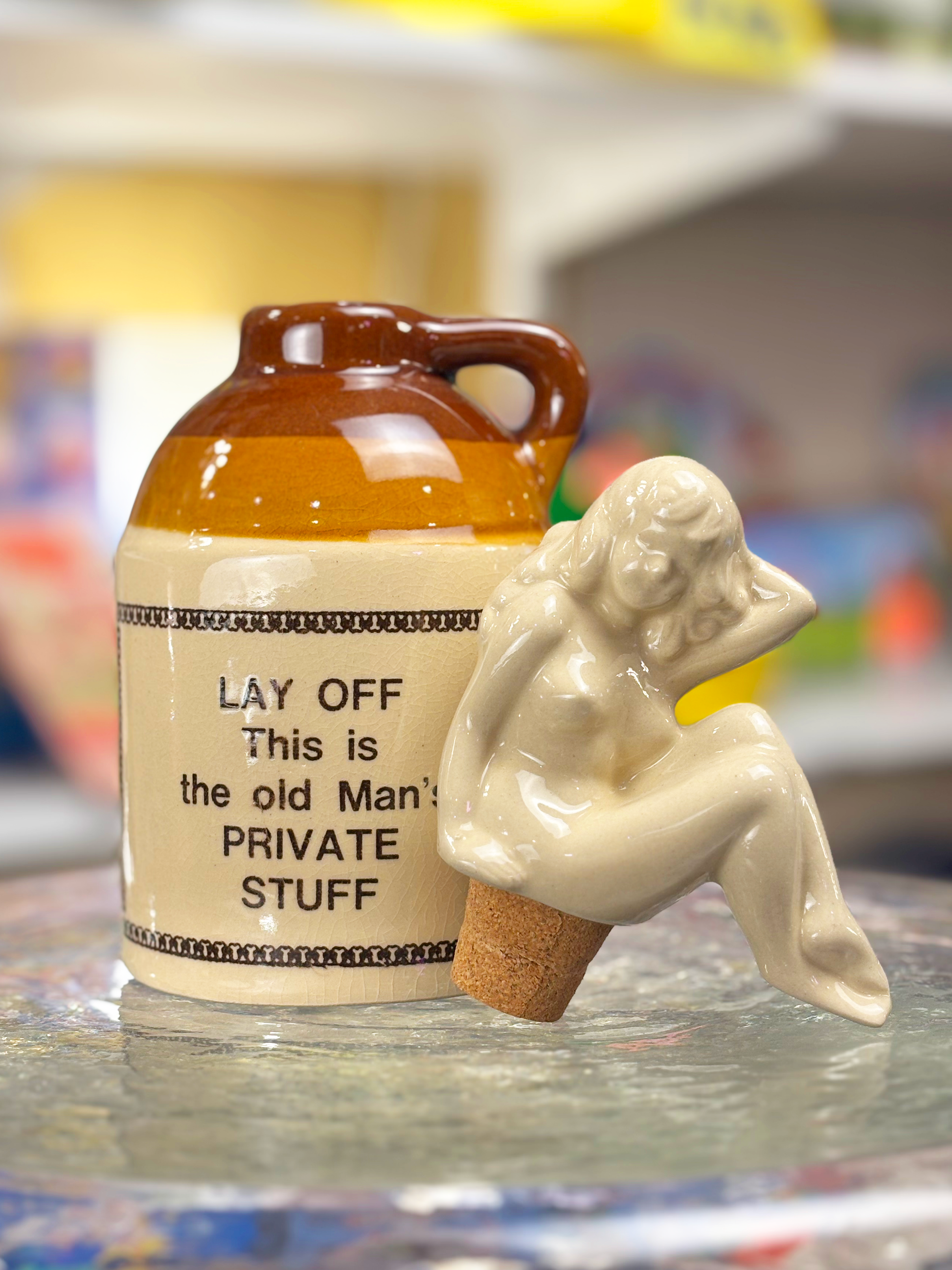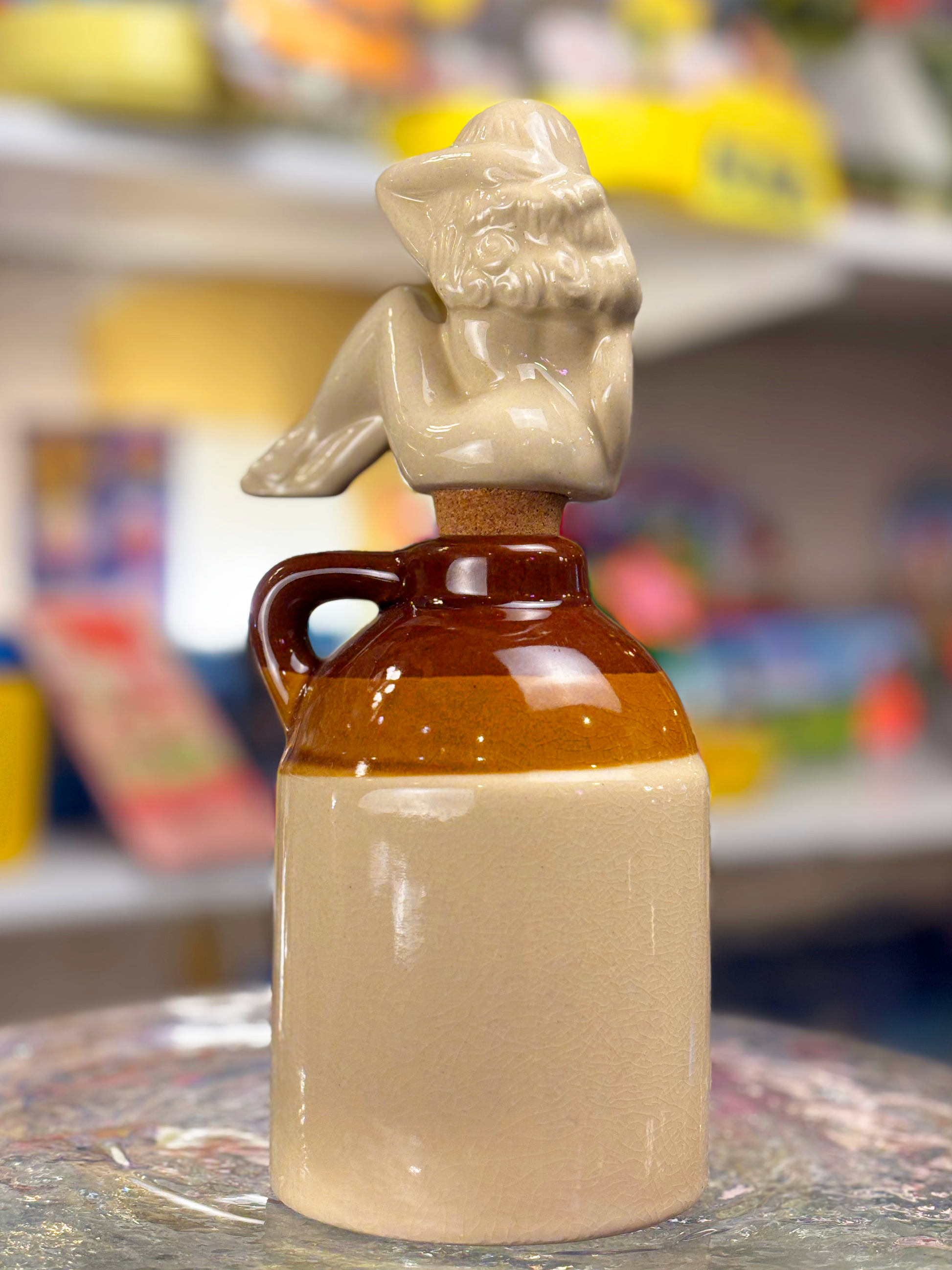 Hands off the jugs! Keep your secret moonshine stash safe with these mini ceramic novelty jugs. The perfect size for some hair of the dog (or some old fashioned molasses). Each jug comes with a voluptuous lady cork to prevent spills and give your pours a little excitement. Deadstock & never used.