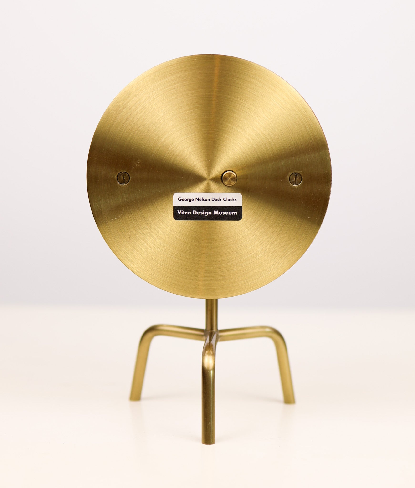 Designed to turn heads, built to keep time. Timeless design meets modern elegance in this re-released George Nelson desk clock from the Vitra Design Museum (old stock, new in box!). A faithful reissue of the iconic midcentury timepiece, this clock features a brushed brass body, minimalist hour markers, and Nelson’s signature geometric hands. Balanced atop a sculptural tripod stand, it’s perfect for desks, shelves, or anywhere you want a touch of retro-futuristic style.