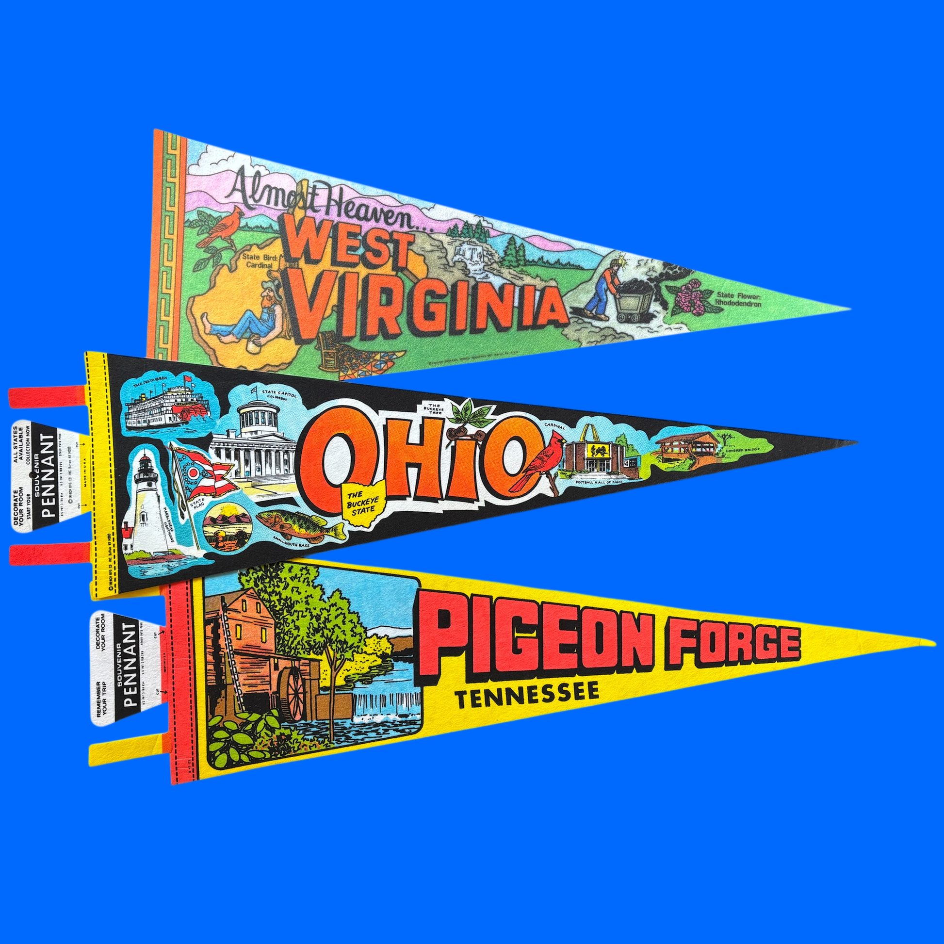 Celebrate your home state with these vibrant deadstock pennants. Featuring retro illustrations representing each location, these make a great gift for the vintage collector or frequent road-tripper in your life.