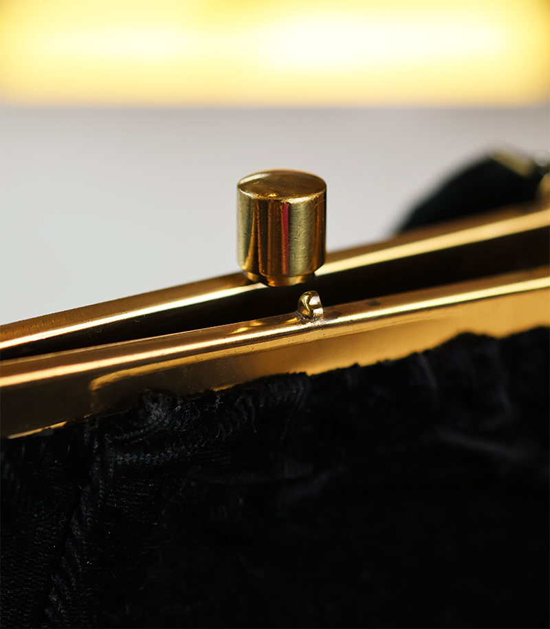 Who needs phone when you've got velvet? This little cutie is the perfect size to fit your wallet, lipstick, and maybe a Tums or two. Featuring brass-tone hardware and mid century glamor, this tiny titan will be sure to turn heads.
