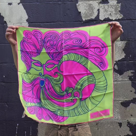 New Old Stock Sant’Angelo silk scarf featuring bold psychedelic "North Wind" print by iconic designer Giorgio di Sant’Angelo. A ‘70s statement piece perfect for adding eccentric flair to any look—tie it around your neck, hair, or bag.