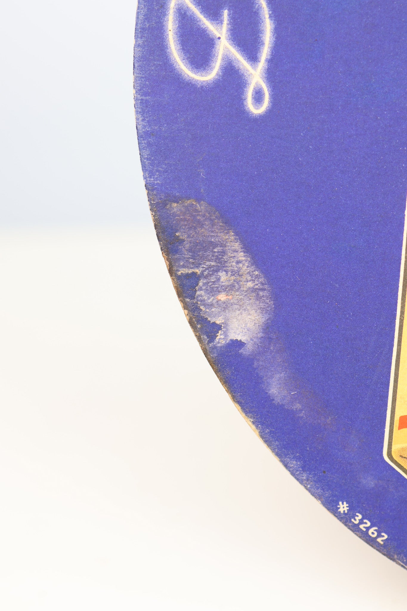 A true tobacco-era relic, this vintage Old Gold Cigarettes sign features bold 1930s-era graphics and iconic branding. Printed on heavy cardstock in a circular format, it advertises the "Double-Mellow" and "Double-Cellophane" features of Old Gold, "The Treasure of Them All." With its vivid navy and gold color scheme and stylized type, this piece brings midcentury Americana back to life. Perfect for collectors of vintage advertising, tobacco ephemera, or kitschy bar decor. In fair vintage condition with minor edge wear and discoloration, plus a small hanging hole.