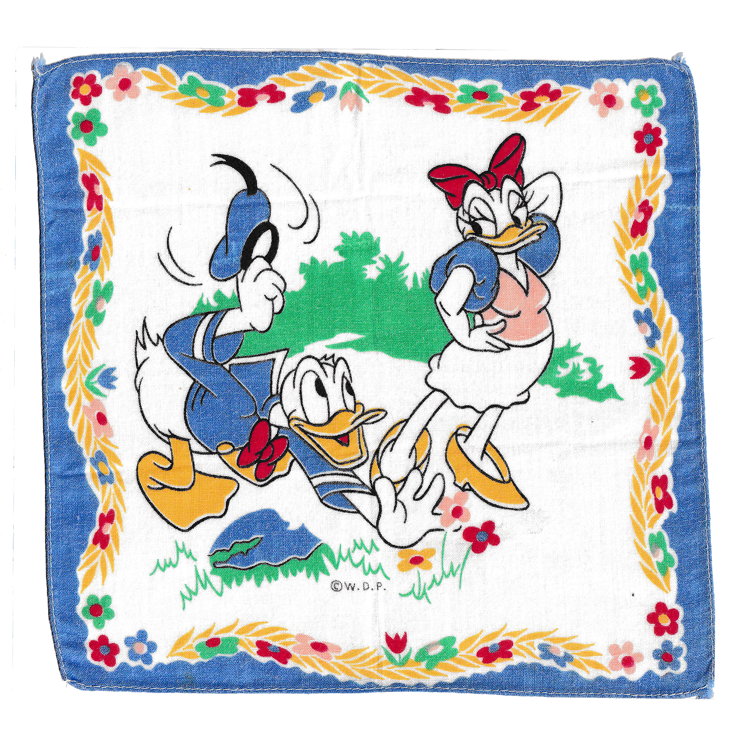 This vintage Disney handkerchief features Donald Duck charming Daisy Duck in a playful scene surrounded by a vibrant floral and wheat motif border. Marked “W.D.P.” (Walt Disney Productions), this soft 100% cotton hankie dates to the pre-1986 era and showcases classic mid-century Disney character art. A charming collectible perfect for fans of vintage textiles, Disney couples, and nostalgic animation style.