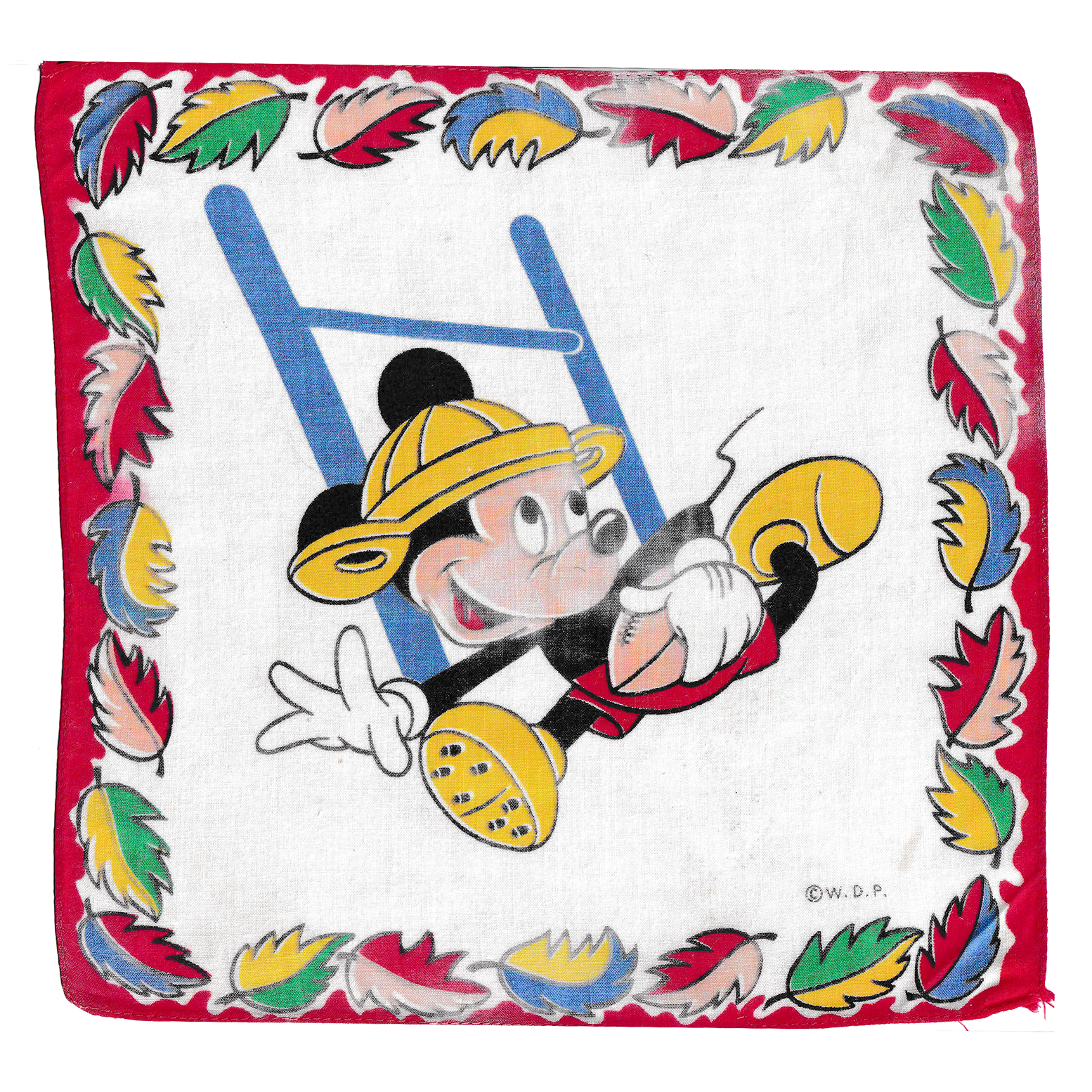This vintage handkerchief features a game-ready Mickey Mouse dressed in football gear,. Surrounded by a vibrant border of multicolored autumn leaves, this 100% cotton hankie is marked with the classic W.D.P. (Walt Disney Productions), dating it to the pre-1986 era, likely 1950s or 60s.