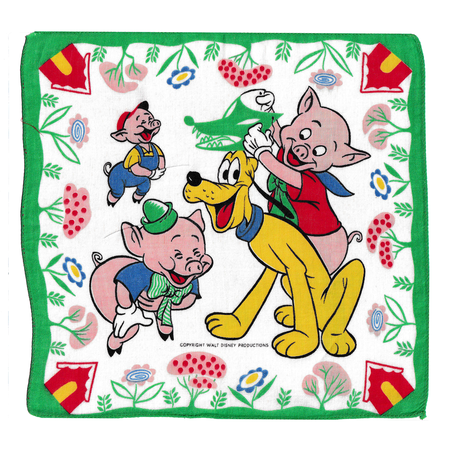 This cheerful mid century Walt Disney Productions handkerchief features Pluto surrounded by the Three Little Pigs in a joyful countryside scene, complete with floral accents, mushrooms, and playful green border details. Printed on soft 100% cotton and marked with the classic pre-1986 W.D.P. copyright, this charming piece captures the whimsy of Disney’s golden era animation in a rare character crossover design.