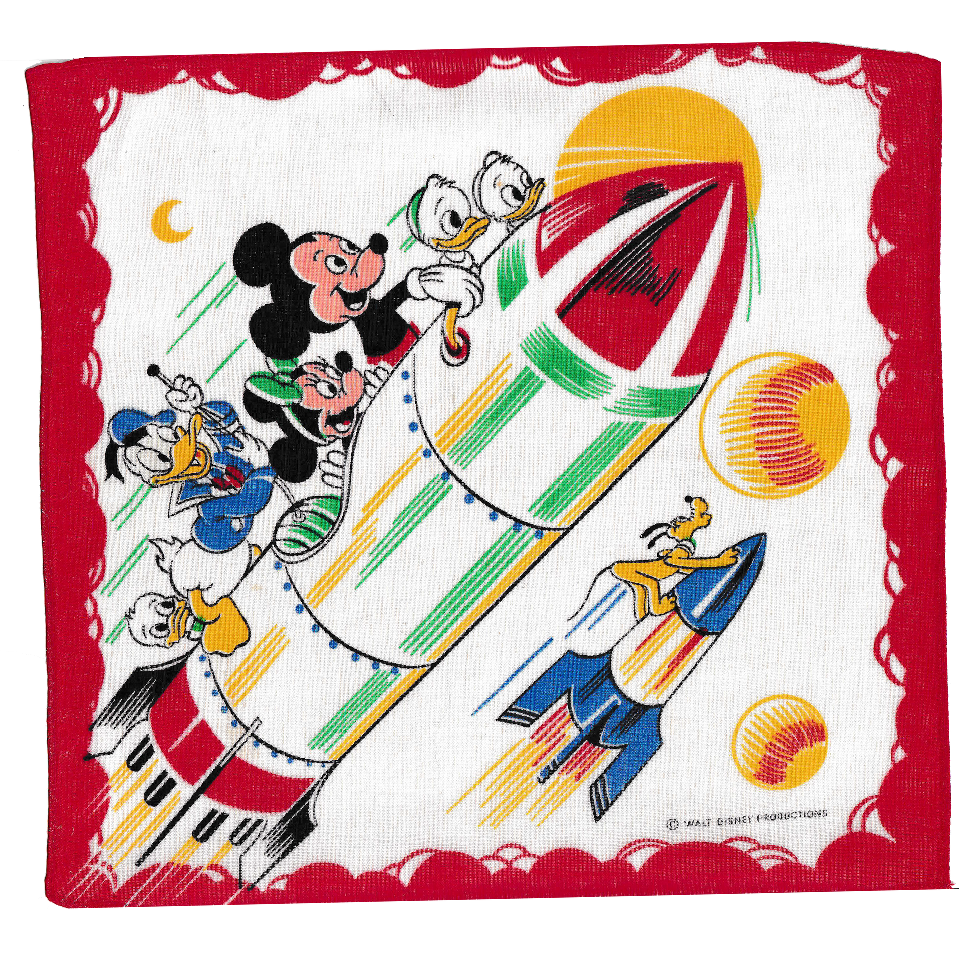 Blast off with this vibrant vintage Walt Disney Productions handkerchief featuring Mickey Mouse, Donald Duck, and Huey, Dewey, and Louie soaring through space on colorful rocket ships—with Pluto tagging along on his own cosmic ride. Set against a bold red scalloped border and retro-futuristic artwork, this 100% cotton hankie captures mid-century Disney imagination at its best. Marked © Walt Disney Productions, confirming its mid century origin.