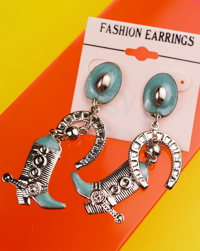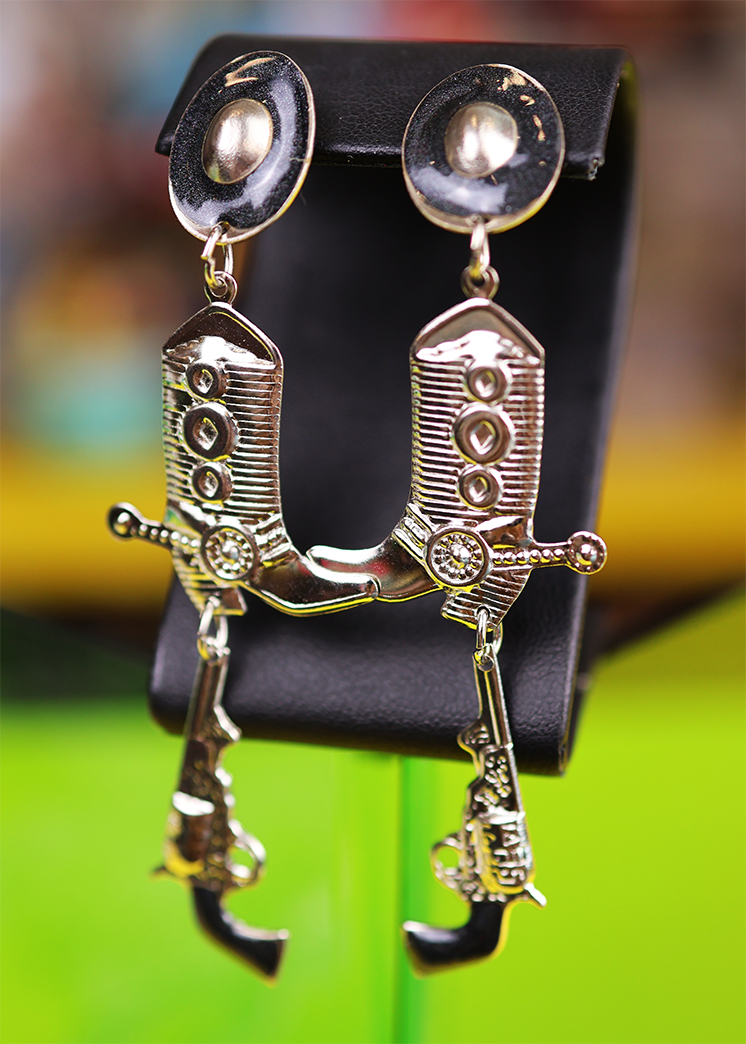 Let's go girls! Featuring shiny silver-tone cowboy hats, studded boots, dangling six-shooters, or classic horseshoes, these deadstock earrings are pure rodeo camp. Perfect for country concerts, Nashville trips, or turning heads at the honky tonk.