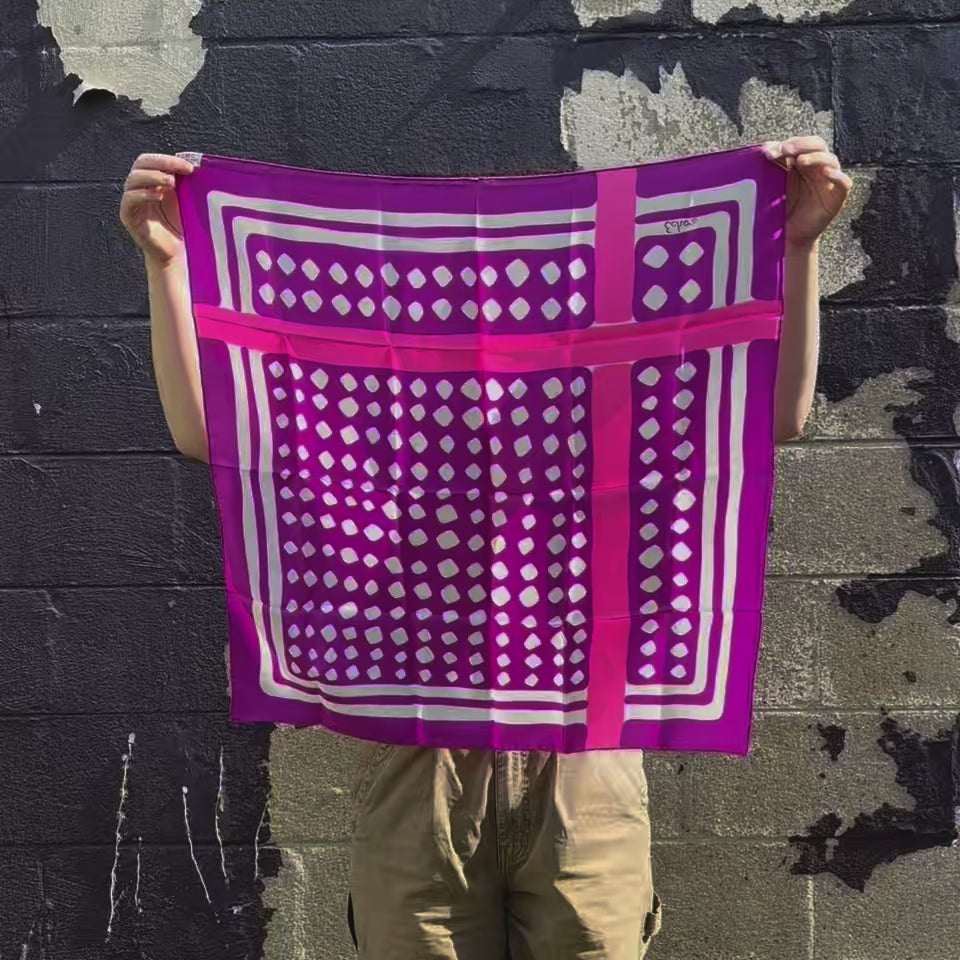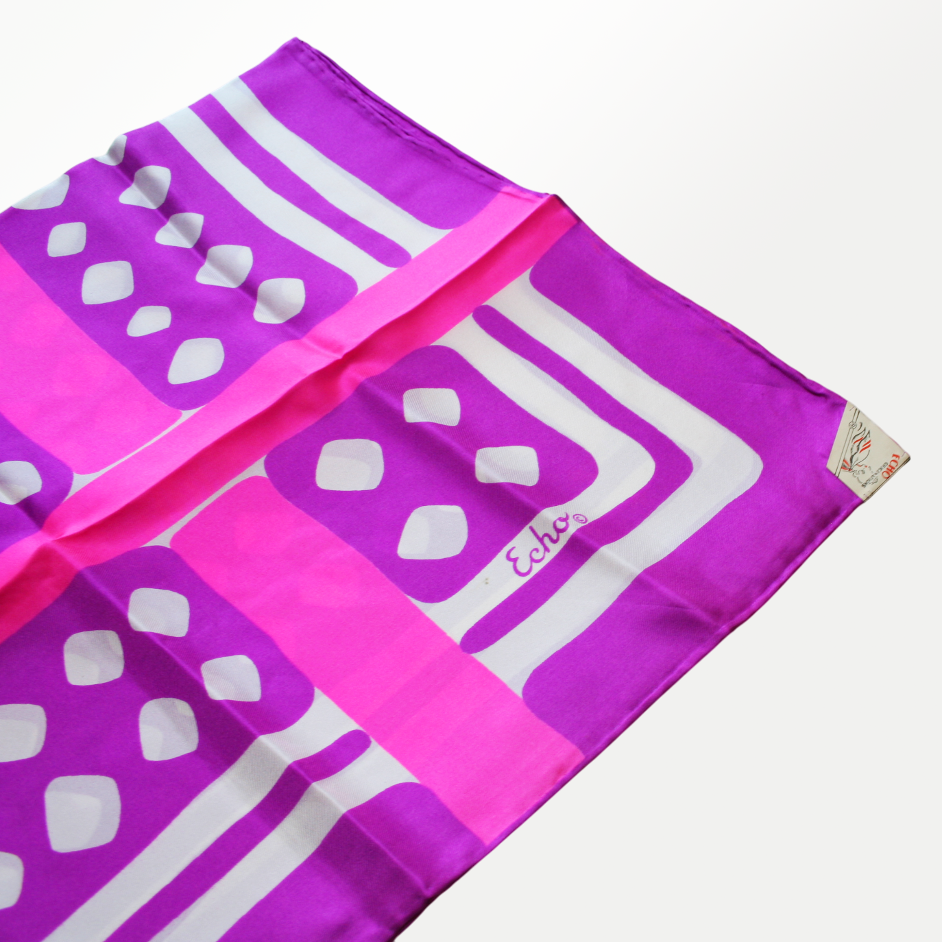 Add a pop of vintage charm with this authentic Echo scarf featuring a vibrant graphic print and hand-rolled hem. Made from 100% silk and signed with the classic Echo logo, it’s a timeless accessory from one of America’s most iconic scarf makers.